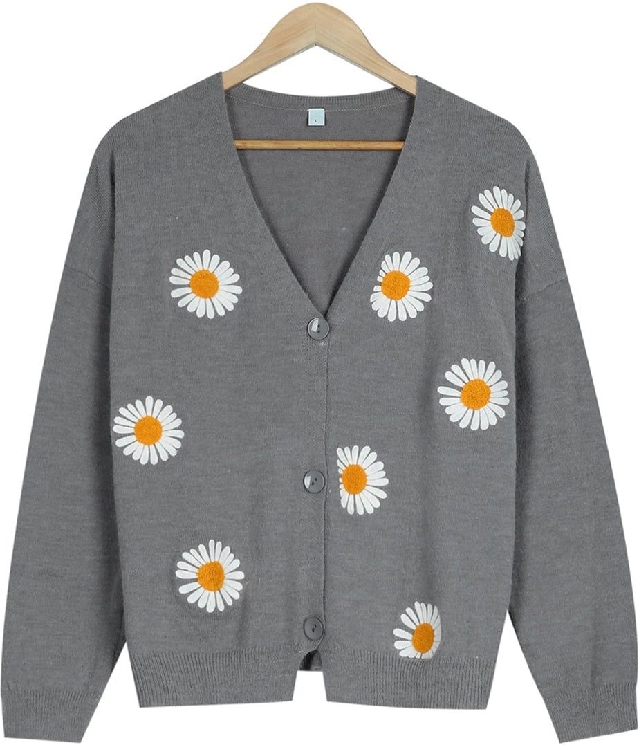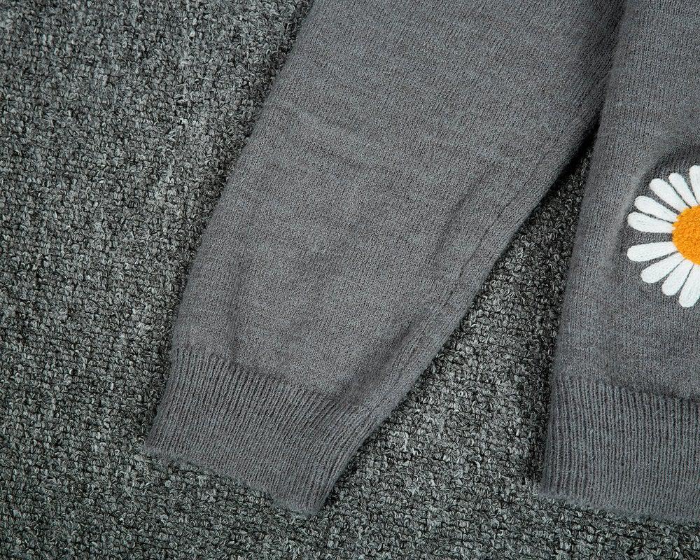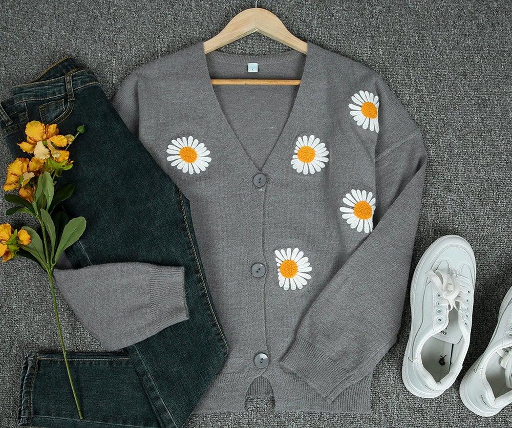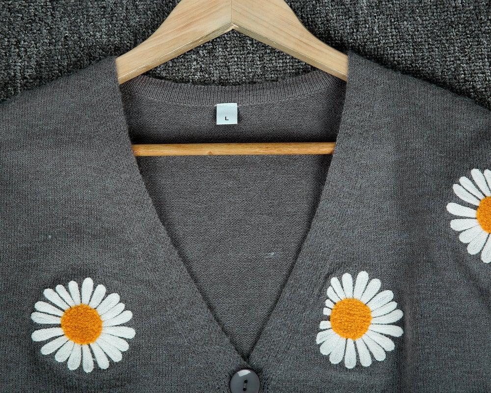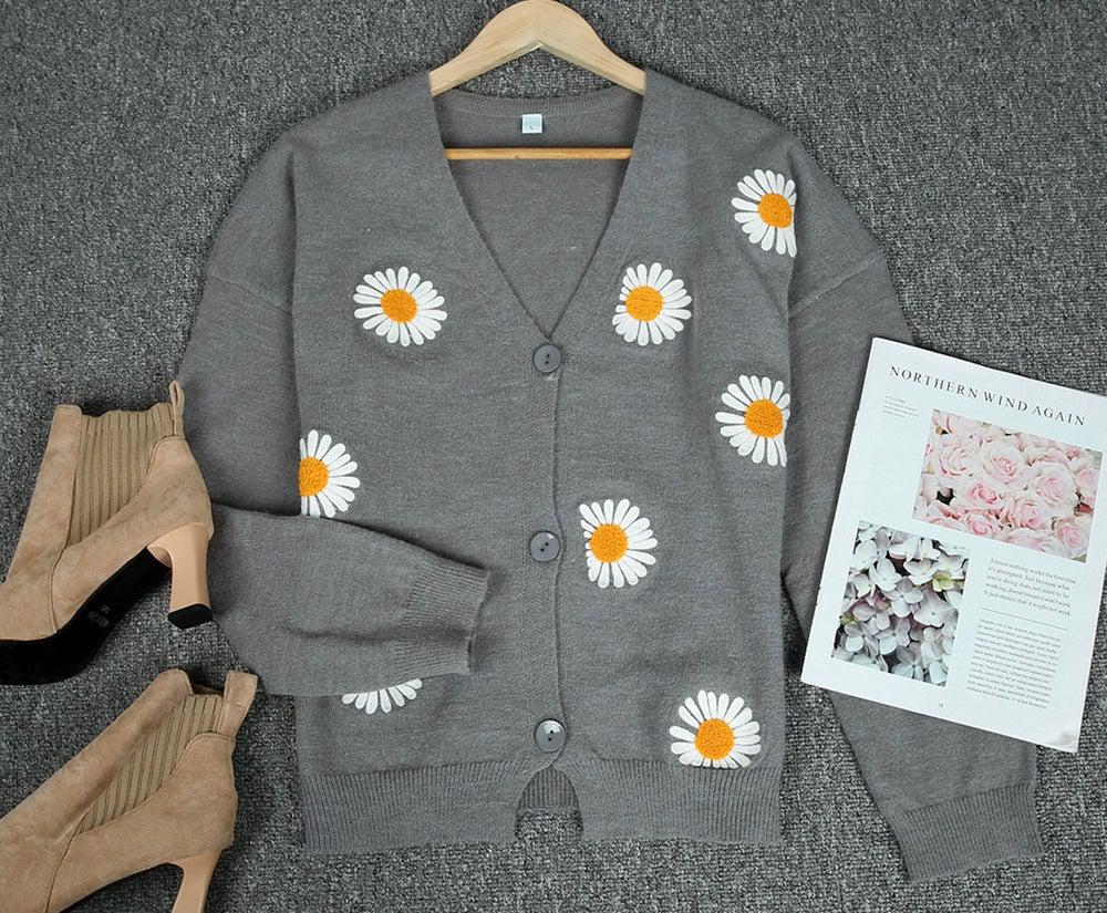 The first picked petal always gives the response you want. You’ll love this cozy summer-to-fall cardigan with daisy decorations—each missing a single petal. Styled with a V-neckline, extra long sleeves and a cropped, notched hem, this sweater has a comfy, modern fit you could rock all by itself or layered over a tissue-thin tee.