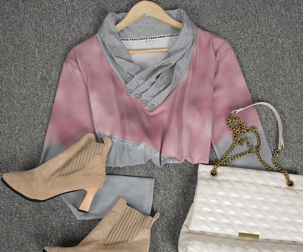 Carpe diem! Seize the day with this bohemian, laid-back top featuring a ruched button front neckline and comfy long sleeves for cooler days. A diagonal sparkling silver-toned stripe separates the luscious pink and cool gray tones, giving it a color block effect waiting to get noticed. Pair this unique top with denim or anything else for a statement vibe. Machine wash normal with light colors or hand wash. Bleach if needed. May be hung up to dry or lay flat. Tumble dry with low heat. Light ironing if needed.