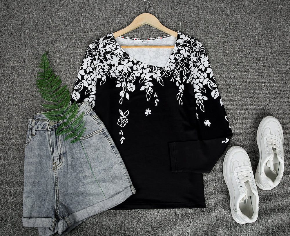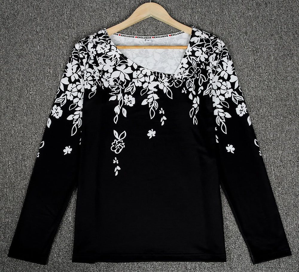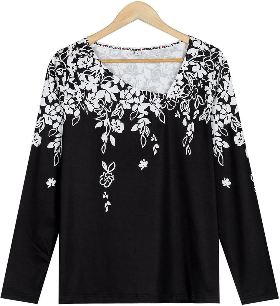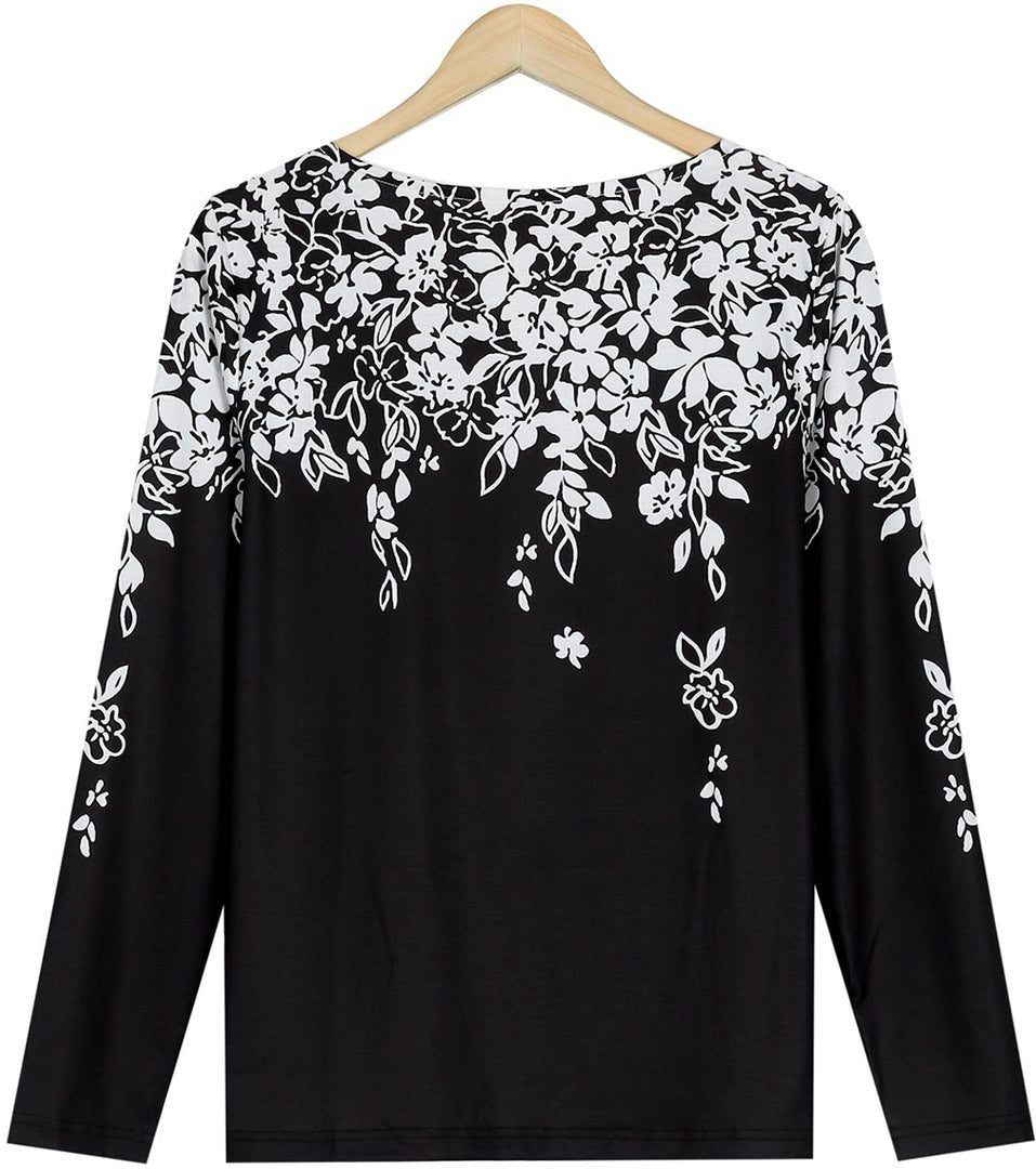Cascading white flowers on this long-sleeved shirt give it an air of sophistication that is perfect for work, casual, or night attire with its contemporary asymmetrical collar. Tuck this beautiful shirt in for a pulled-together look, or wear it loose if you choose. Easy to mix and match with its black and white pattern, wear this pretty shirt with black pants or denim.